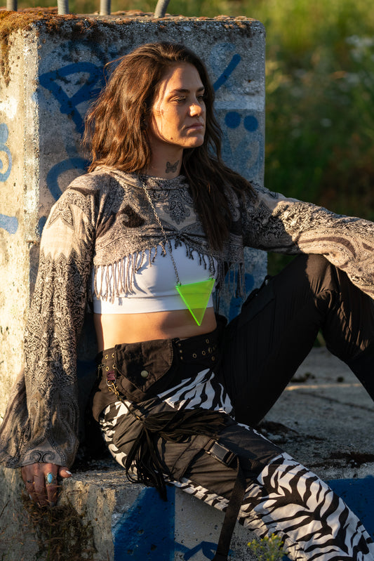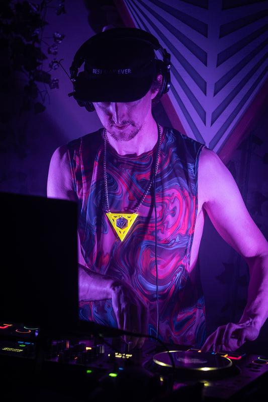 All of our necklaces are made with 1/4" acrylic that glows under black light. We create each of our designs in house, and laser cut the acrylic at our home studio in Victoria BC.